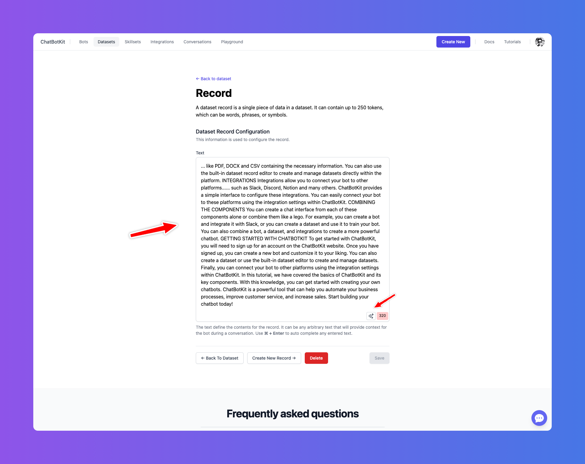 We are excited to announce that the ChatBotKit Dataset Records can now be automatically transformed to FAQs Records. This new feature allows you to split out your data into frequently asked questions that are most likely to be answered by the chatbot. This results in a higher quality of chat conversations and a better overall user experience.