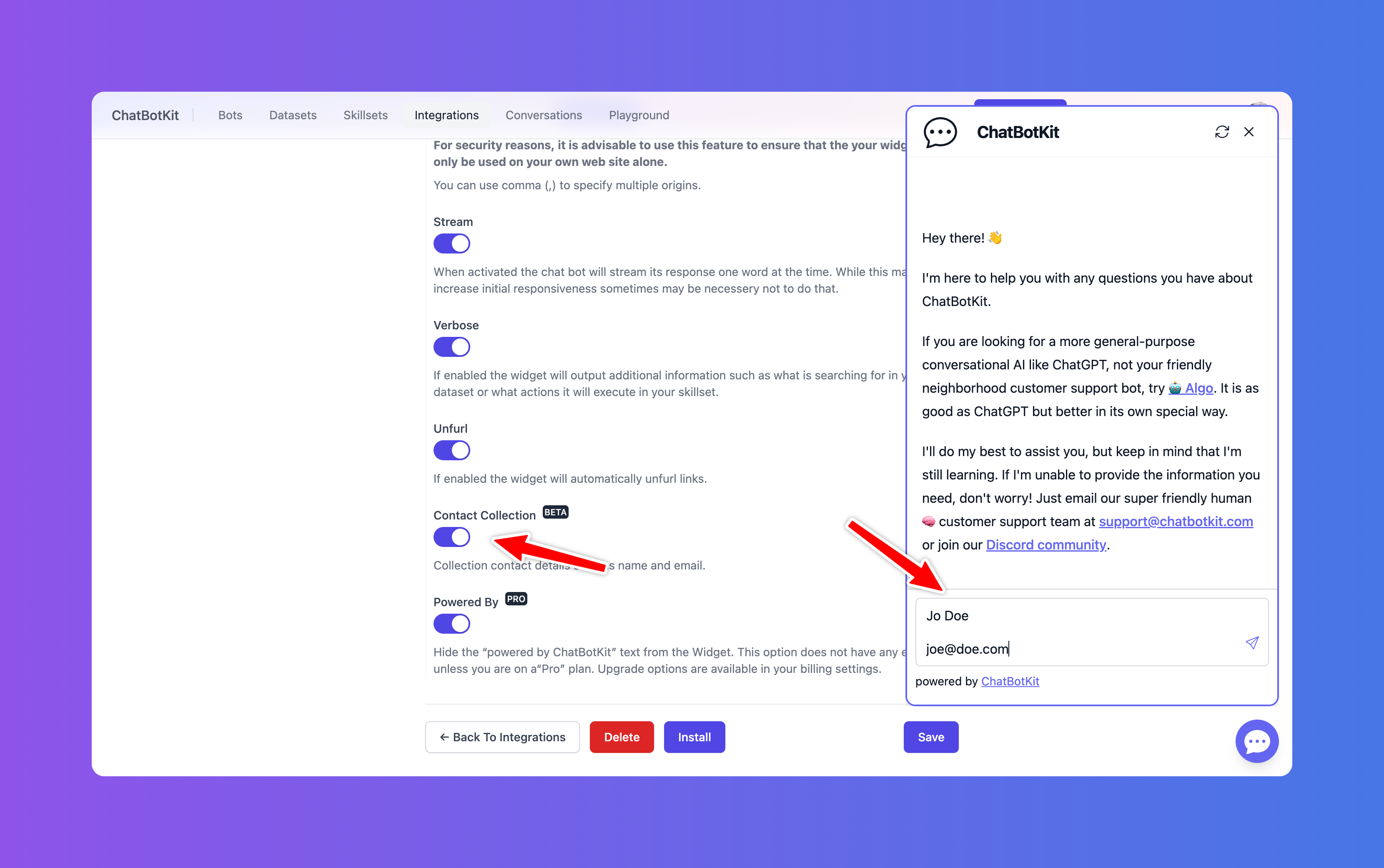 We're excited to announce that ChatBotKit Widget Integration now supports contact collection! Once enabled, this feature will convert the standard widget chat input into an input that accepts the user's name and email. Once provided, the information is captured as part of the conversation.