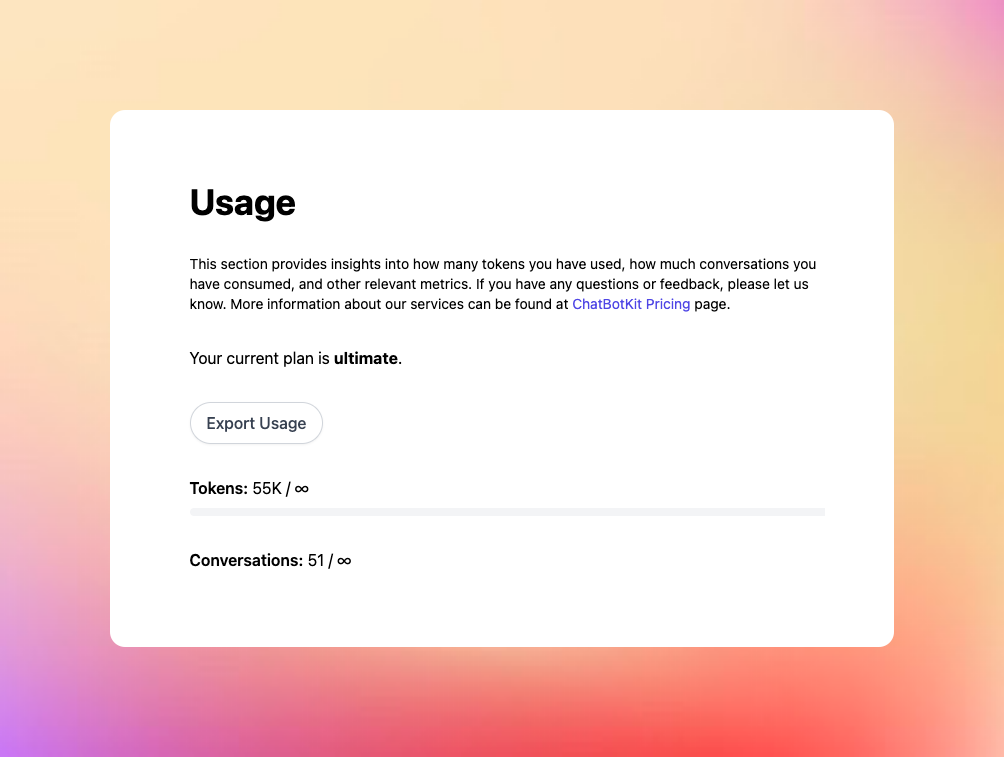 At ChatBotKit, we're committed to continually enhancing our platform to better serve our users' needs. The introduction of the Export Usage Button is yet another step in our ongoing effort to provide a user-friendly, insightful, and efficient platform for all our customers.