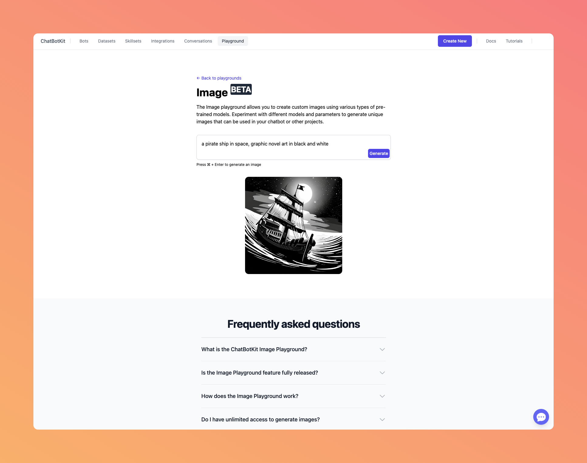 Imagine a space for experimentation, trial, and fun within the realms of artificial intelligence! We're rolling out the ChatBotKit Image Playground - a unique platform that brings creativity and technicality together. With the first in the lineup, the Image Playground, users can now design custom images using various types of pre-trained generative models. Enjoy the freedom to tweak different models and parameters, crafting unique images that can be incorporated into your chatbot or other projects. It's user-friendly, innovative, and hit ⌘ + Enter to watch the magic unfurl!