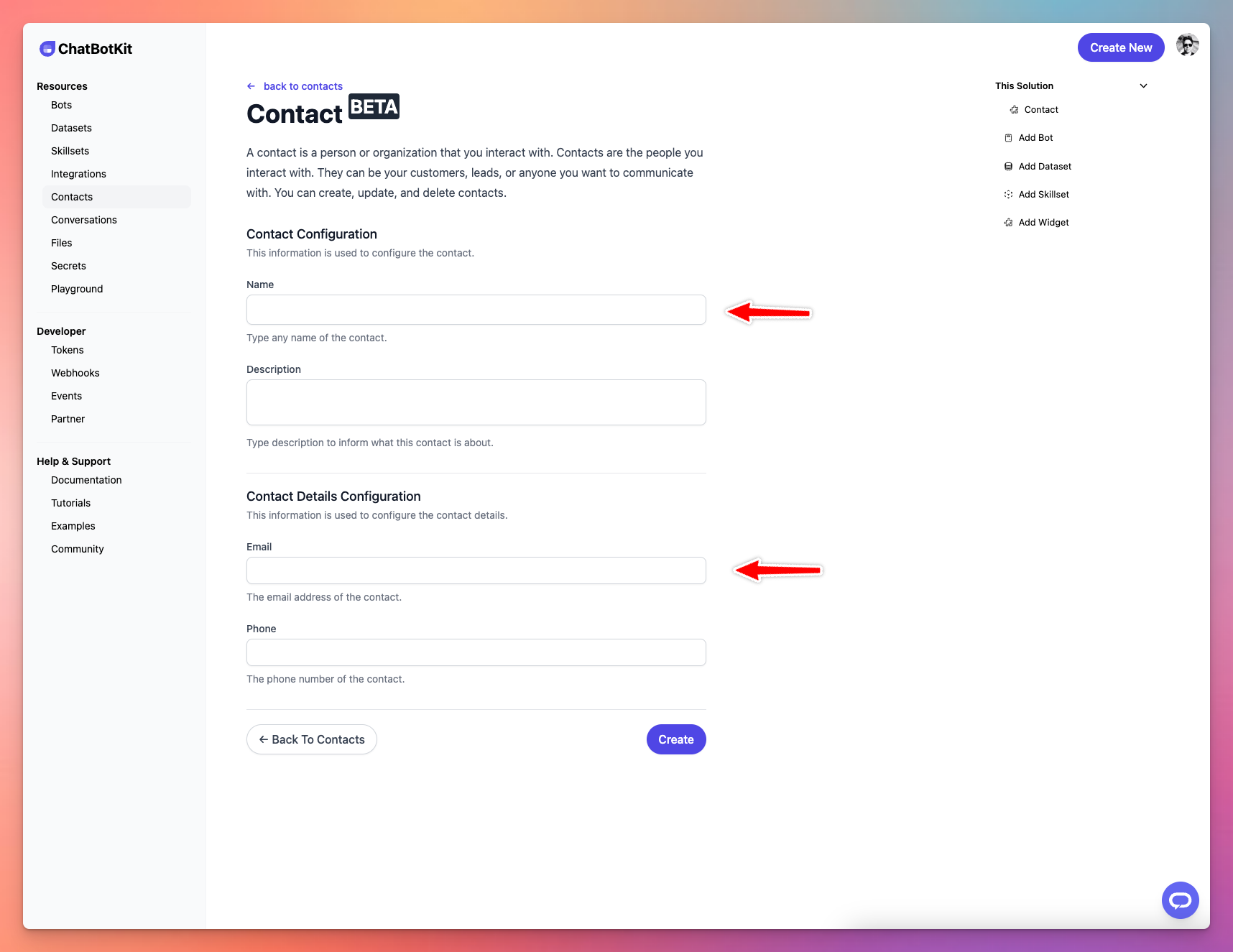 Alongside the Email Integration, ChatBotKit has enhanced its Contacts feature, which now supports both manual and automatic creation of contact profiles. This development is integrated across various platform tools, including email and widget interactions, providing businesses with robust tools to collect and manage contact information effectively.