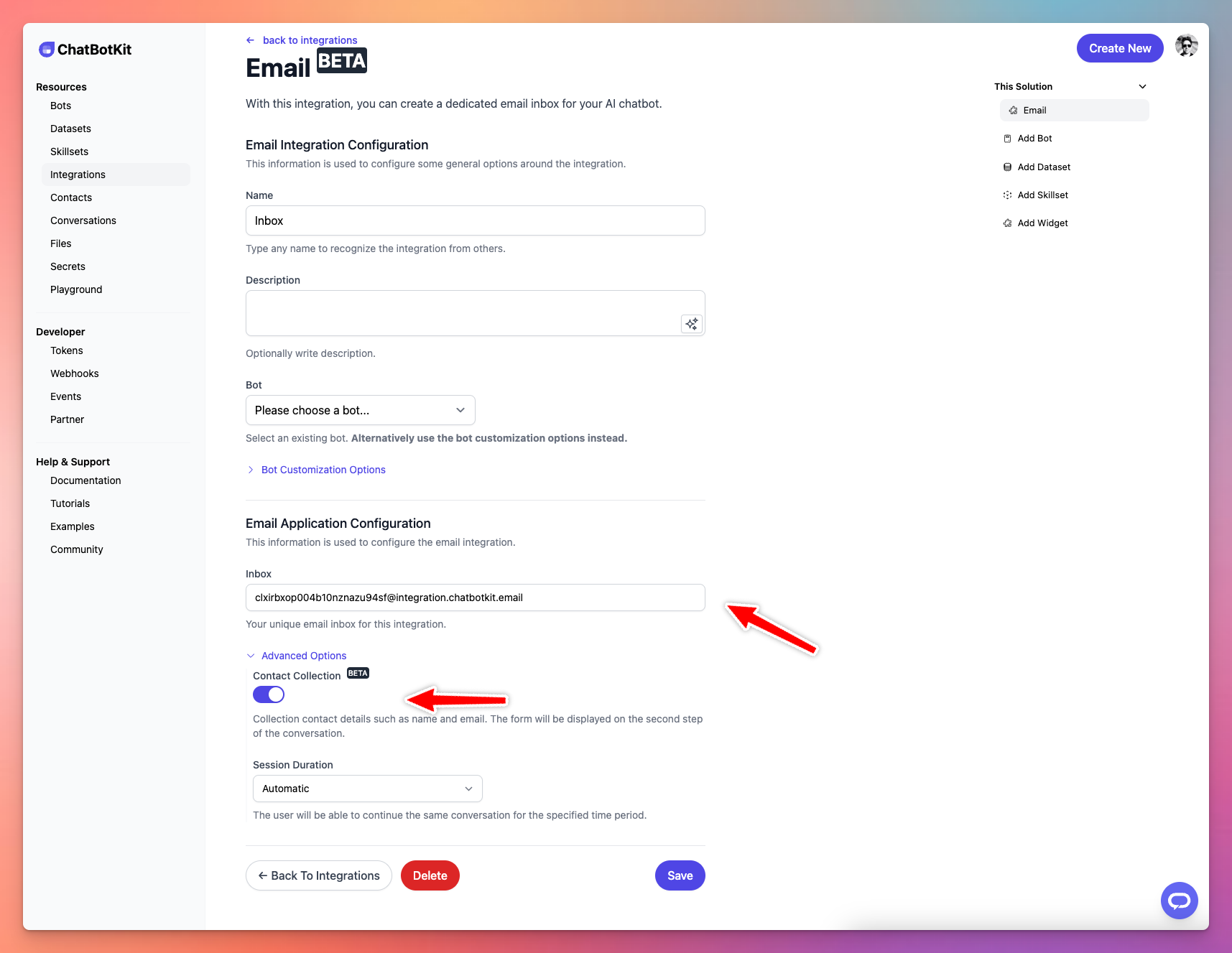The new Email Integration allows businesses to set up a dedicated email inbox for their AI chatbots, enabling seamless handling of incoming emails directly through the ChatBotKit platform. This feature not only simplifies email management but also ensures that all communications are centralized, making it easier for businesses to keep track of interactions and respond more promptly.