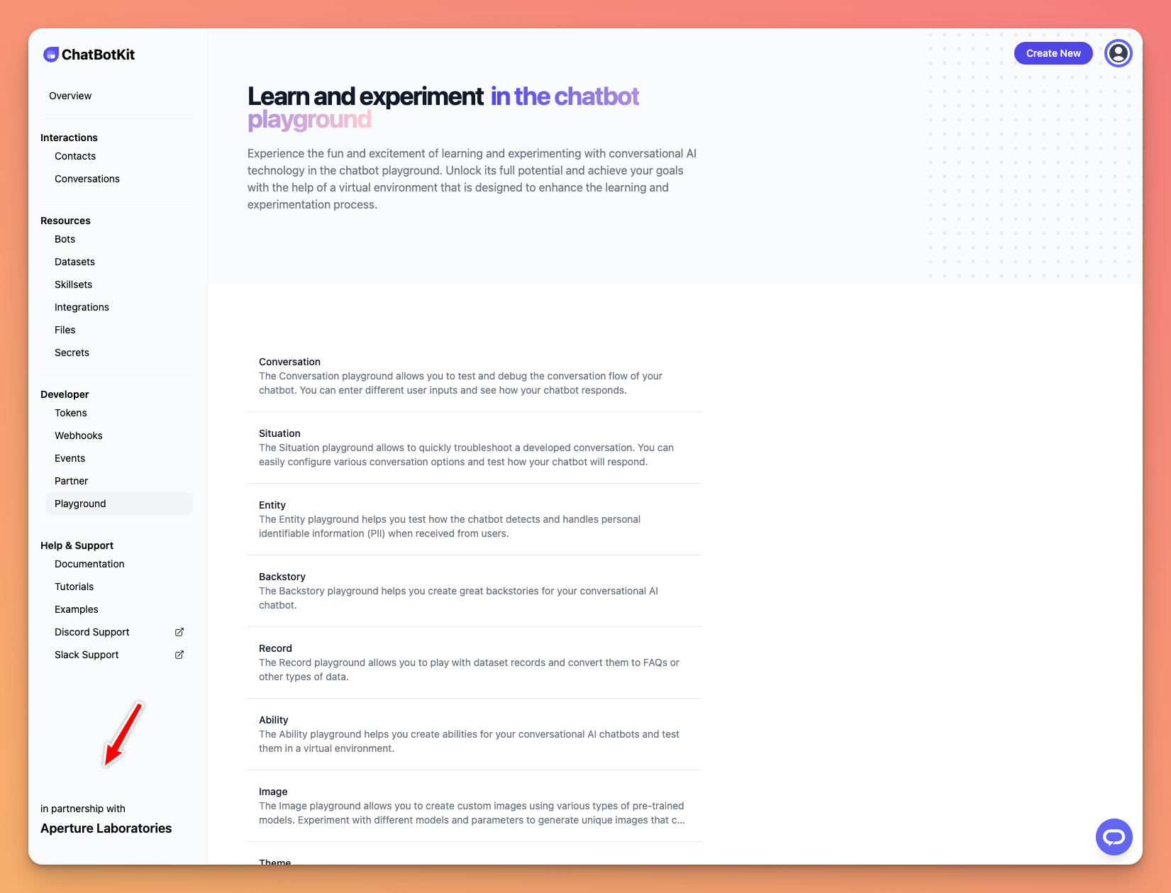 Each partner receives a dedicated account and domain name (e.g., aperture.chatbotkit.partners). This portal features a separate login page for your customers, distinct from ChatBotKit's main customer base.