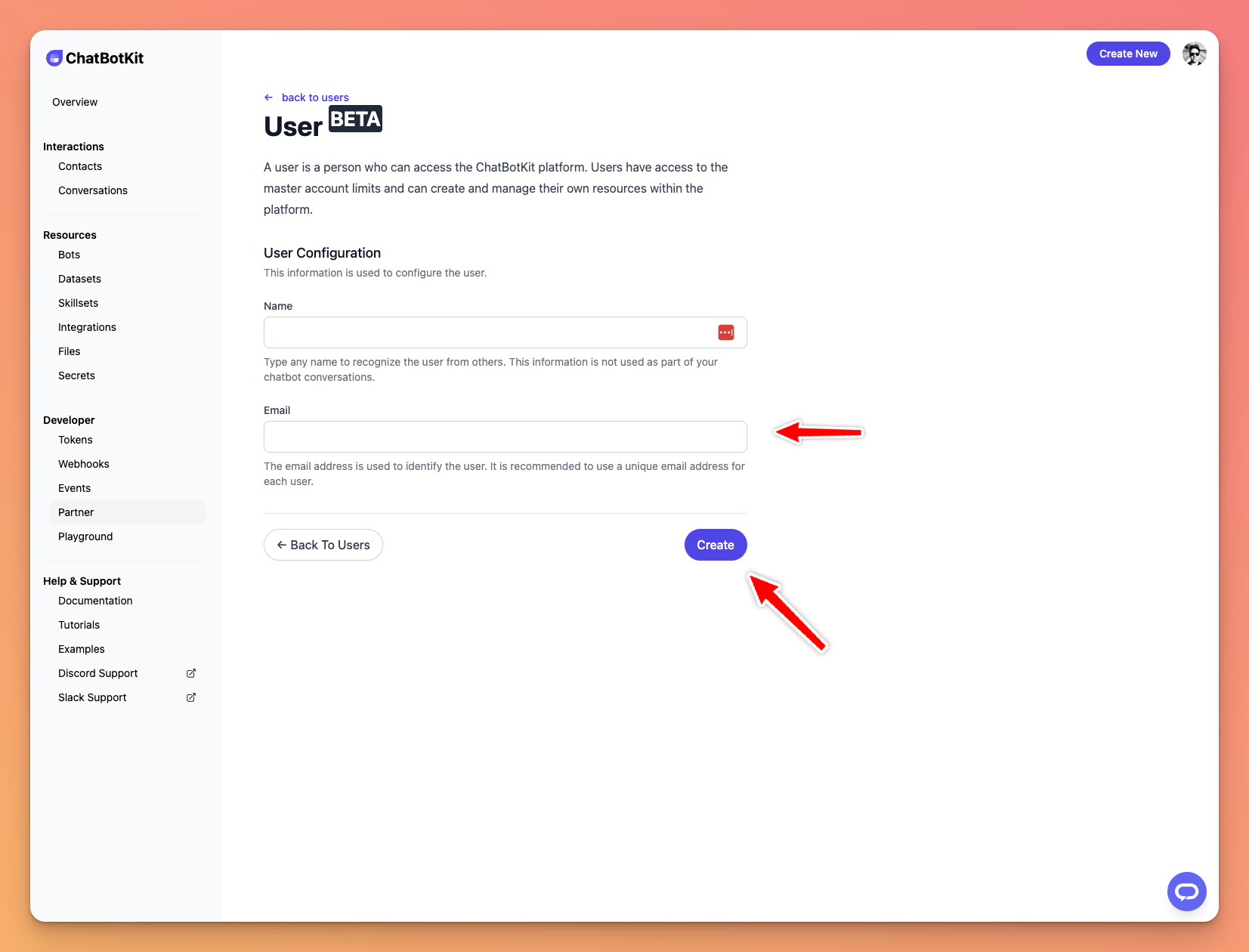 For more information on how to use the ChatBotKit Partner API, please review the API documentation.