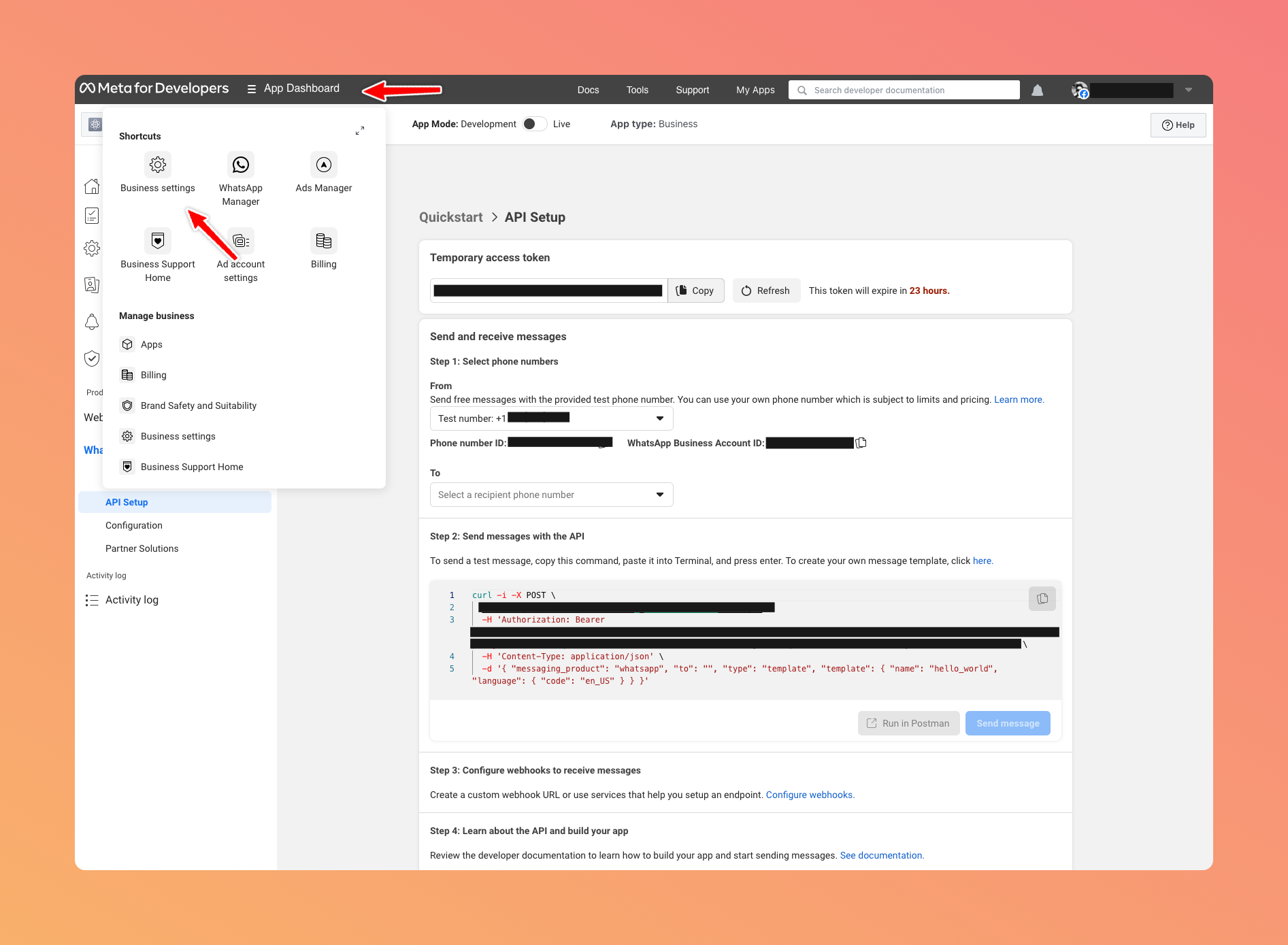 Go to "API Setup" and copy your "Phone number ID". You need to either buy or setup a test phone number if you do not have one already.