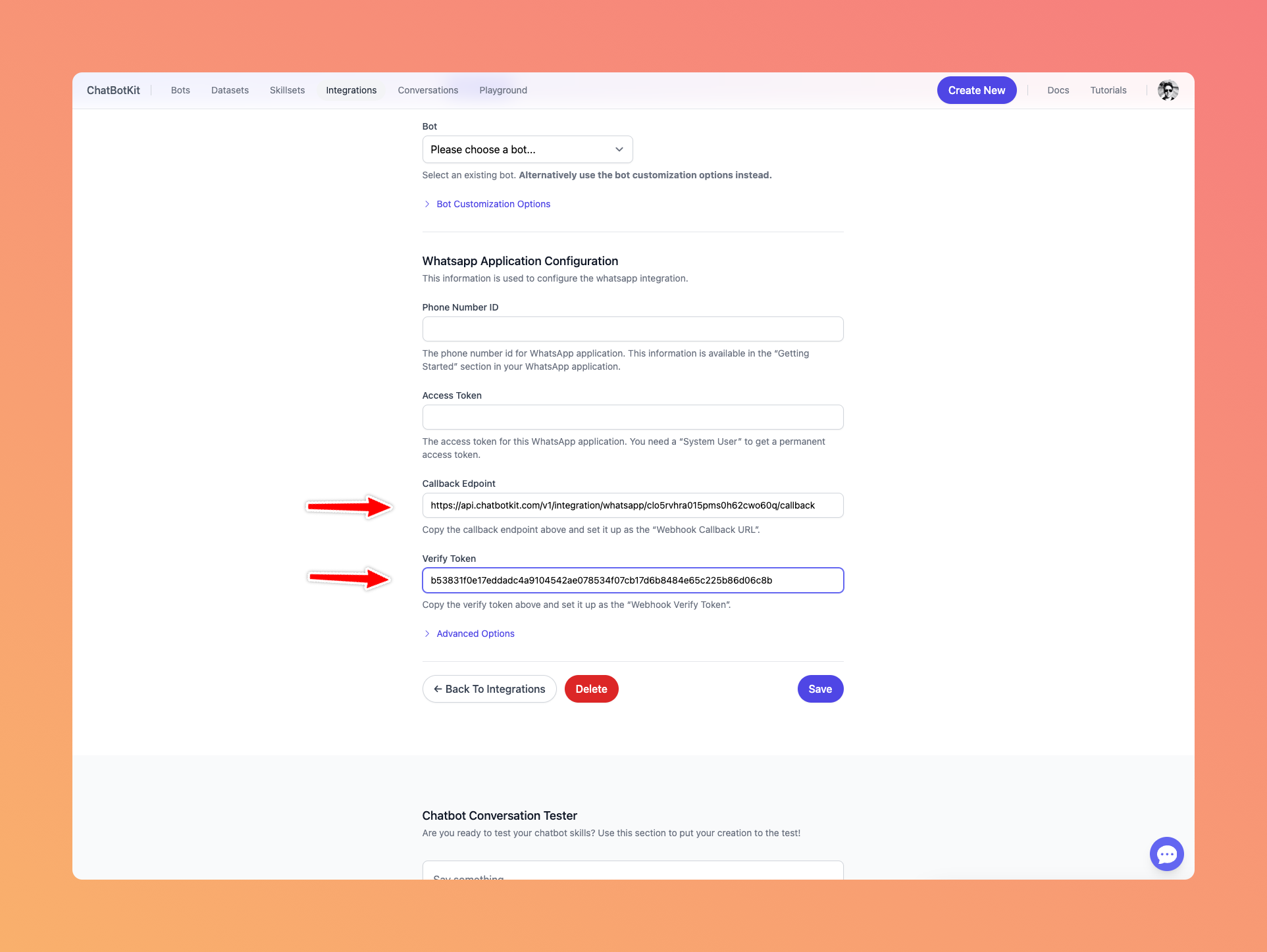 Go to ChatBotKit and create a new WhatsApp Integration.