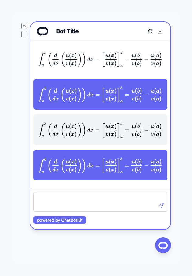 This feature is fully customizable, allowing users to tailor the appearance of equations to fit their specific needs. Whether adjusting the size, font, or layout, the flexibility offered by the ChatBotKit Widget ensures that it can seamlessly integrate into any website or application. This customization is particularly useful for educators and developers who want to maintain consistent visual aesthetics across their platforms while delivering complex technical content.