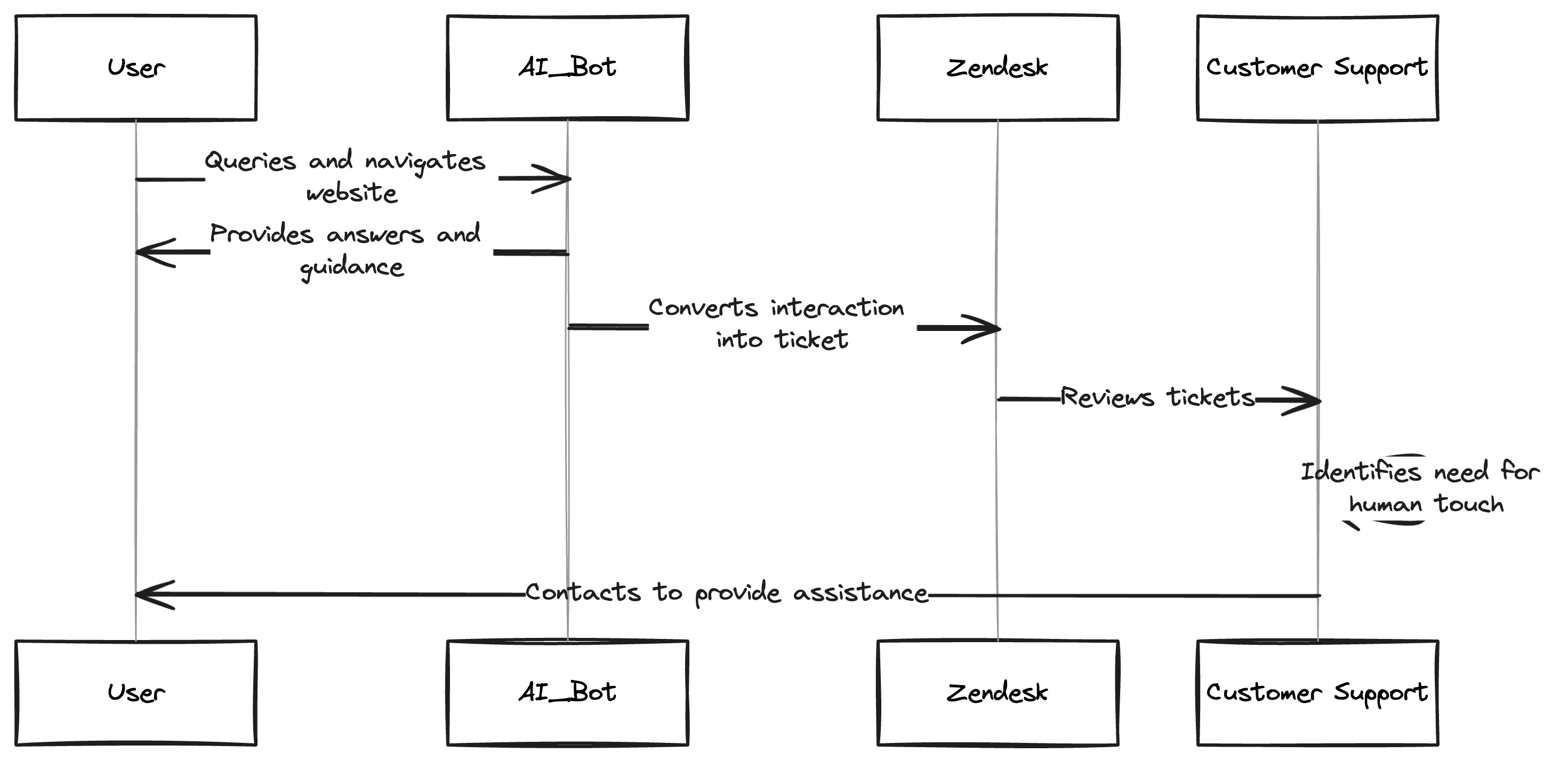 We've taken that model and given it a good shake: our AI is your first point of contact, equipped to answer most queries and guide you through the website. However, we understand that sometimes, you need the human touch. That's where our customer support team comes in. Each interaction with our AI bot is automatically converted into a ticket and sent to our team in Zendesk. They review these tickets, and when they see a question requiring their expert touch, they contact you to provide additional assistance.
