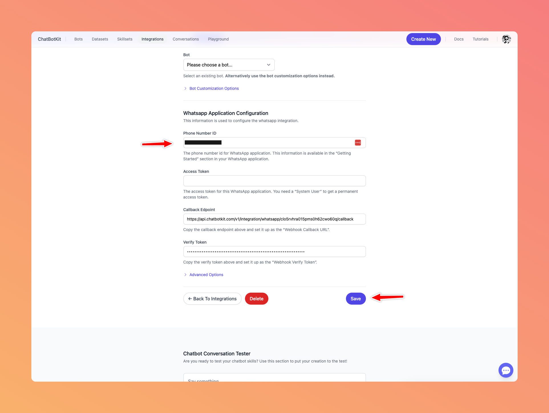 Paste the "Phone Number ID" in ChatBotKit and click the "Save" button.