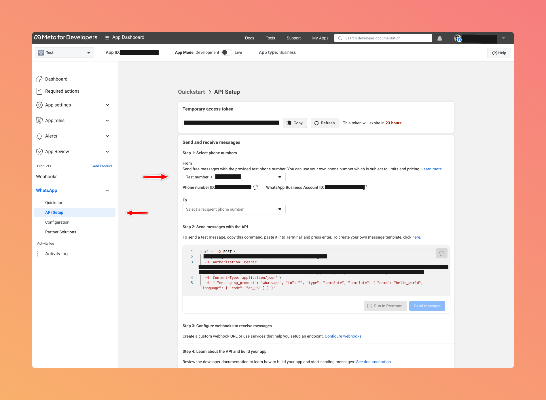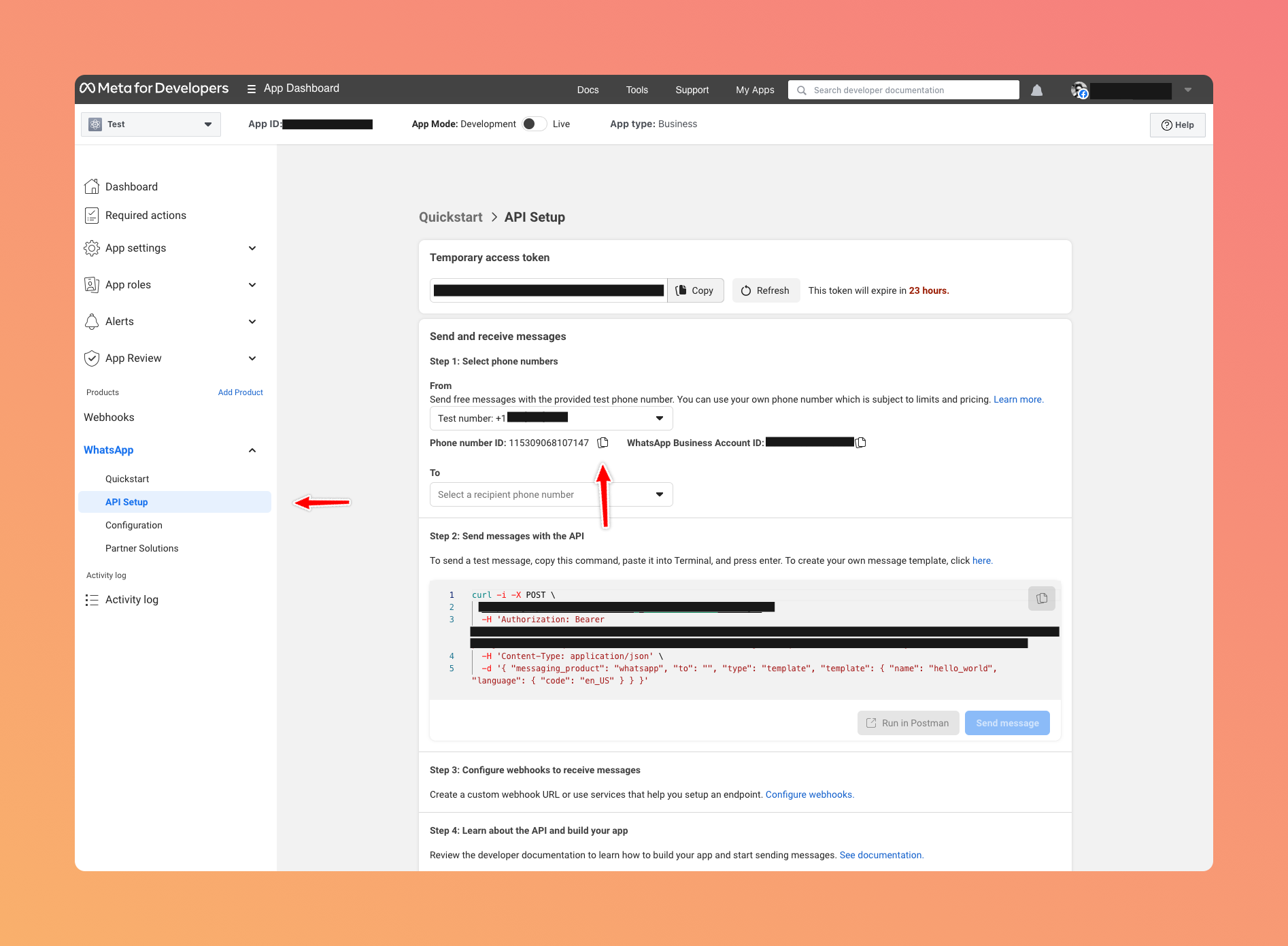 Go to "API Setup" and copy your "Phone number ID". You need to either buy or setup a test phone number if you do not have one already.