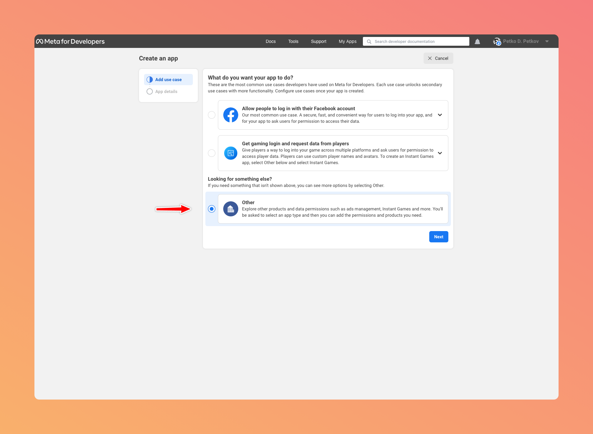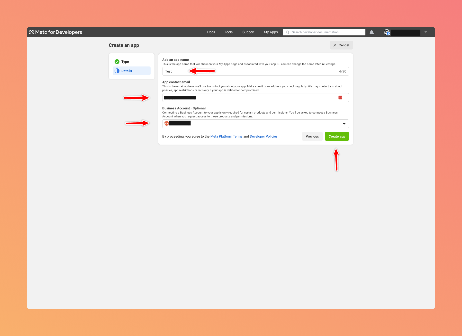 Name your app, type in your email and select your business account. Click the "Create app" button.