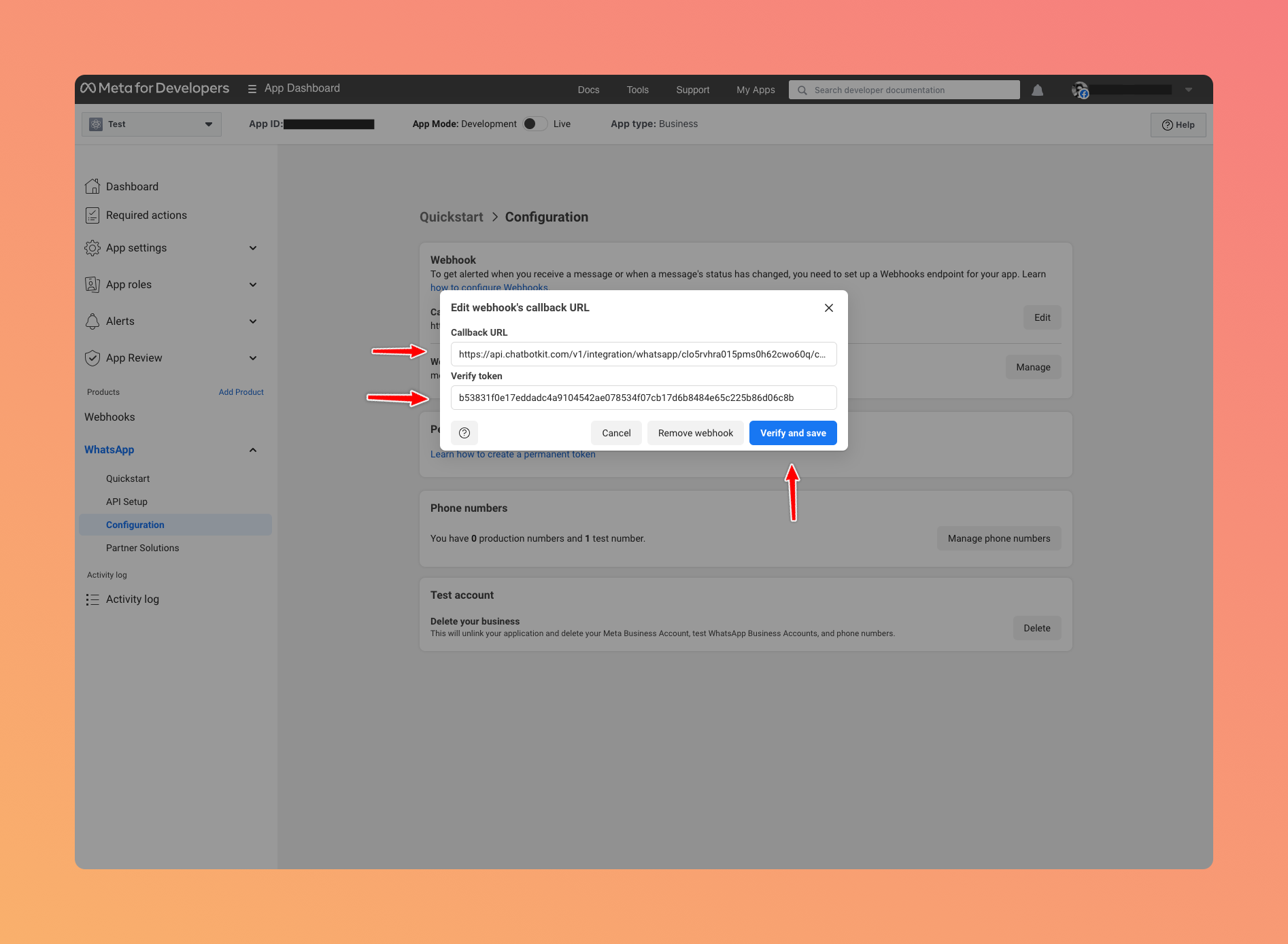 Copy the "Callback Endpoint" and "Verify Token" we saved in step 3 and click on the "Verify and save" button.
