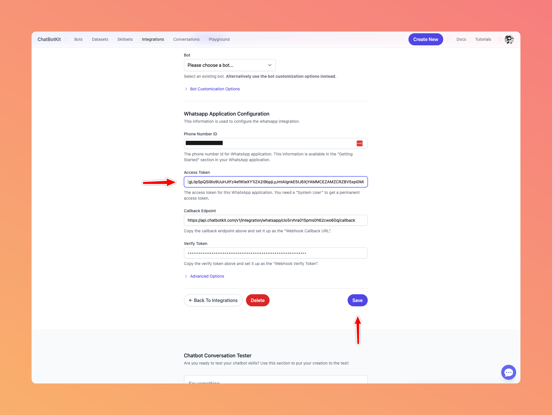 Paste the token in your ChatBotKit integration and press the "Save" button.