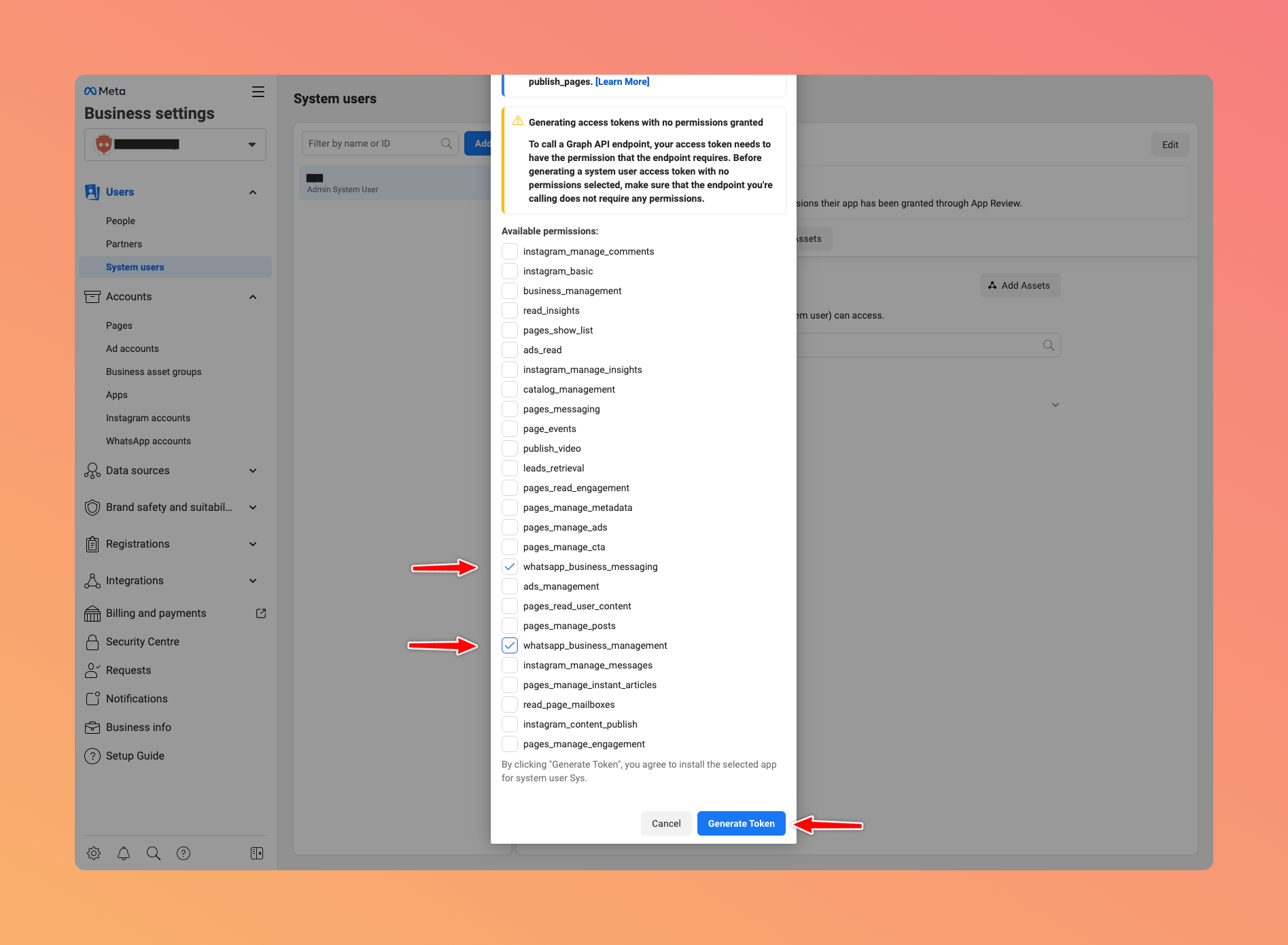 Select your app from the dropdown list. Make sure you also select bot "whatsapp_business_messaging" and "whatsapp_business_management" options from the permissions list. Finally, click the "Generate Token" button.