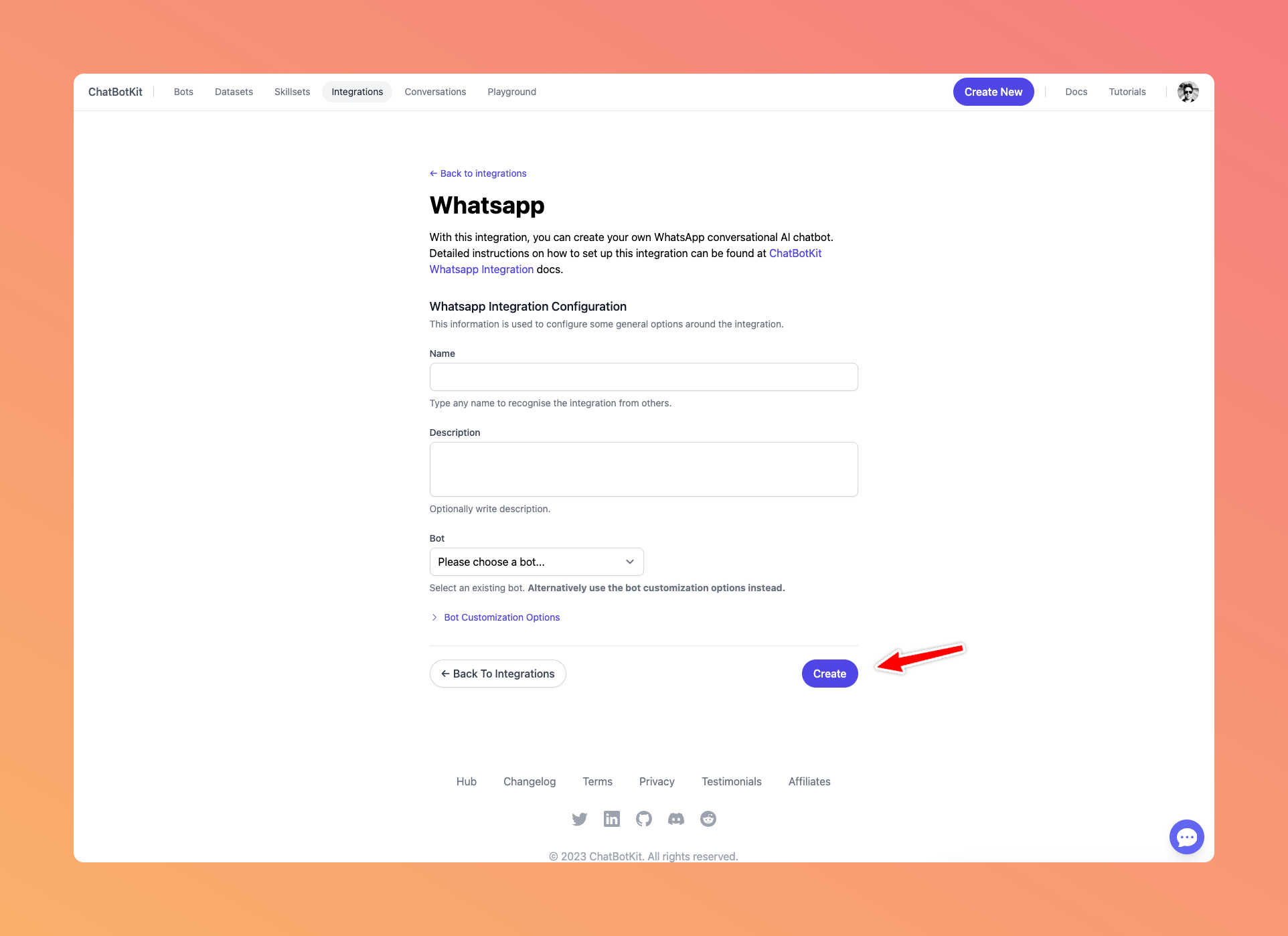 Go to ChatBotKit and create a new WhatsApp Integration.